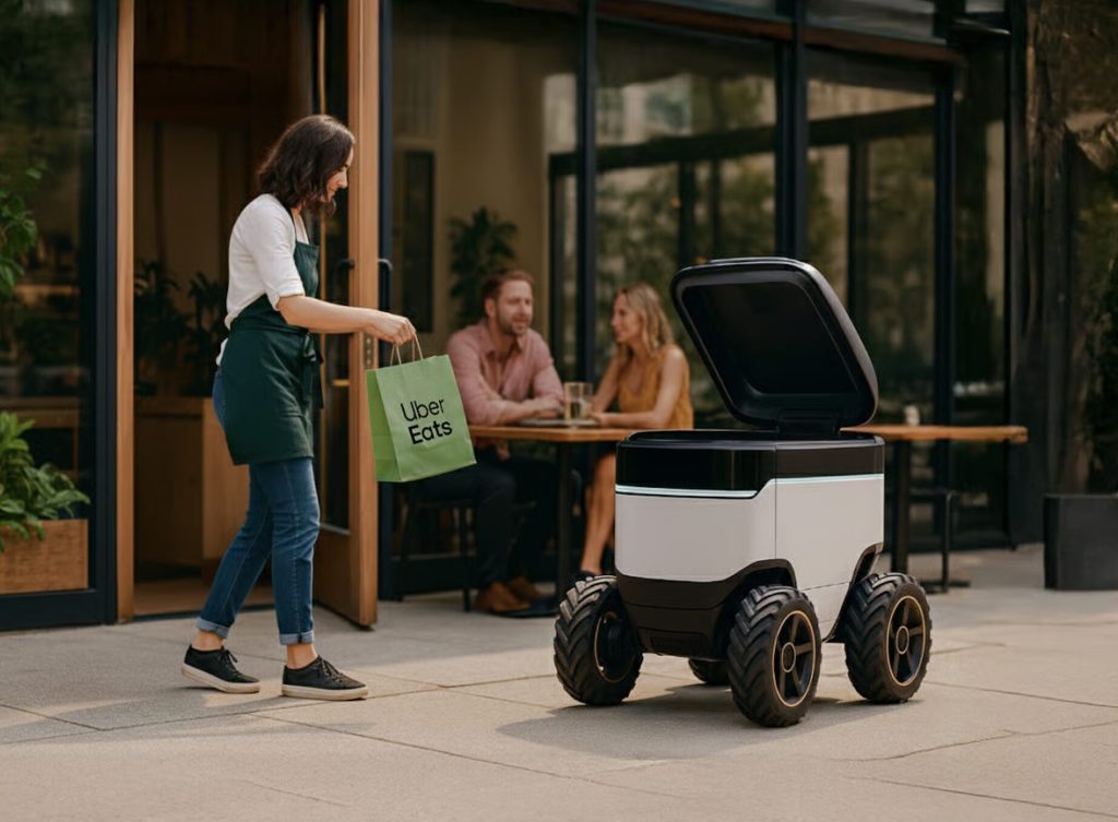 Uber Eats là một trong những đơn vị tiên phong triển khai robot giao hàng tự hành, hợp tác với nhiều công ty như Avride, Cartken, Coco, Nuro, Serve Robotics và Waymo. Hiện dịch vụ đã có mặt tại 11 thành phố như Tokyo, Dallas, Jersey City.